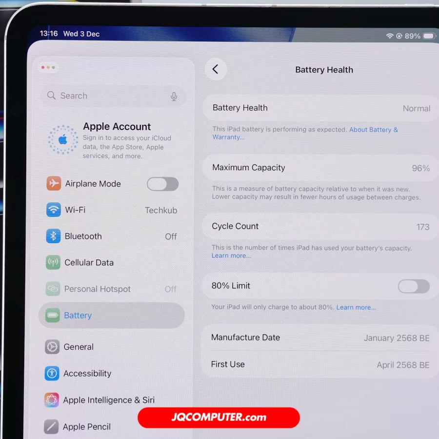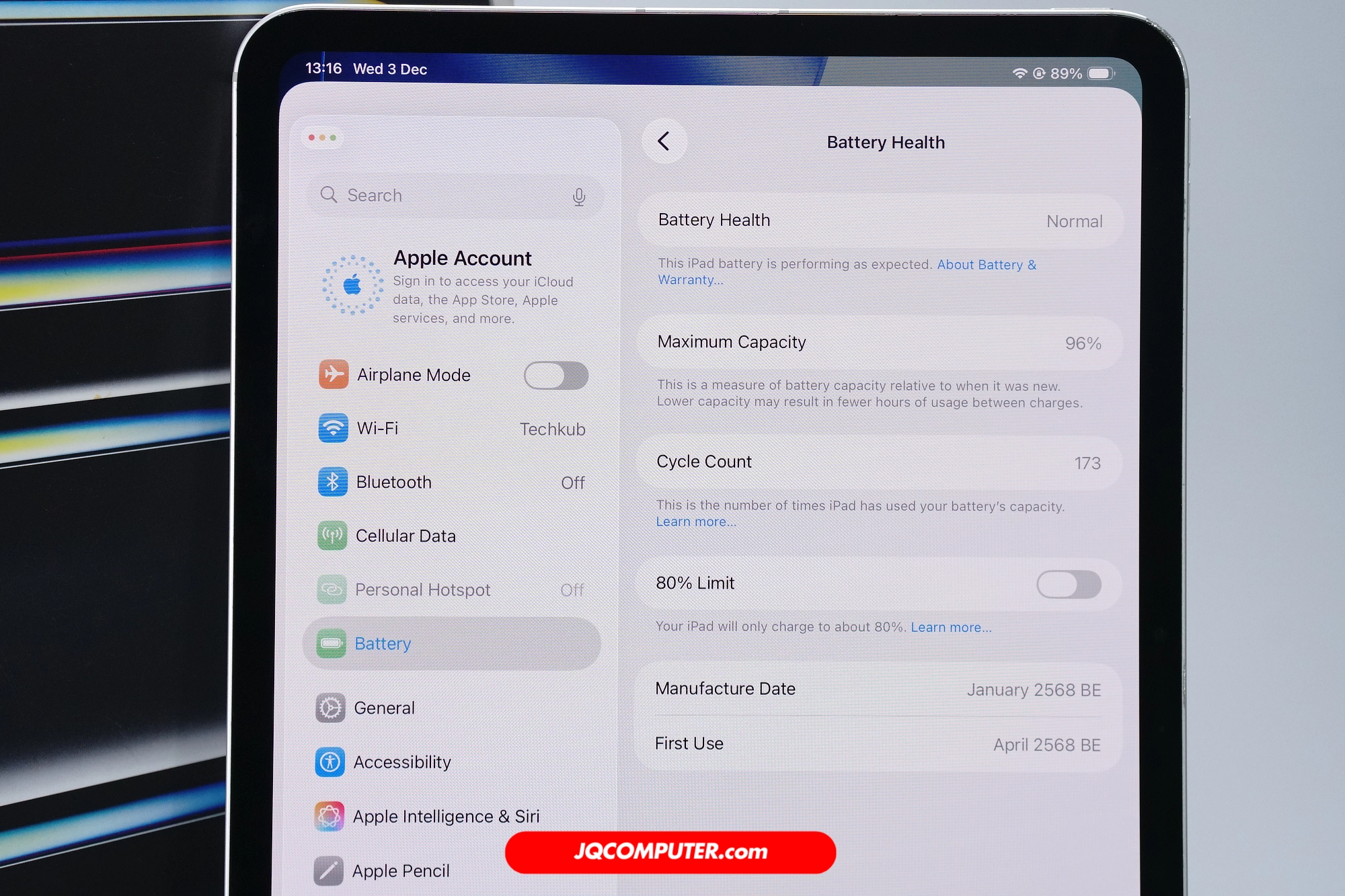 | สุขภาพแบตเตอรี่ | 96% (Cycle Count: 173 รอบ) |