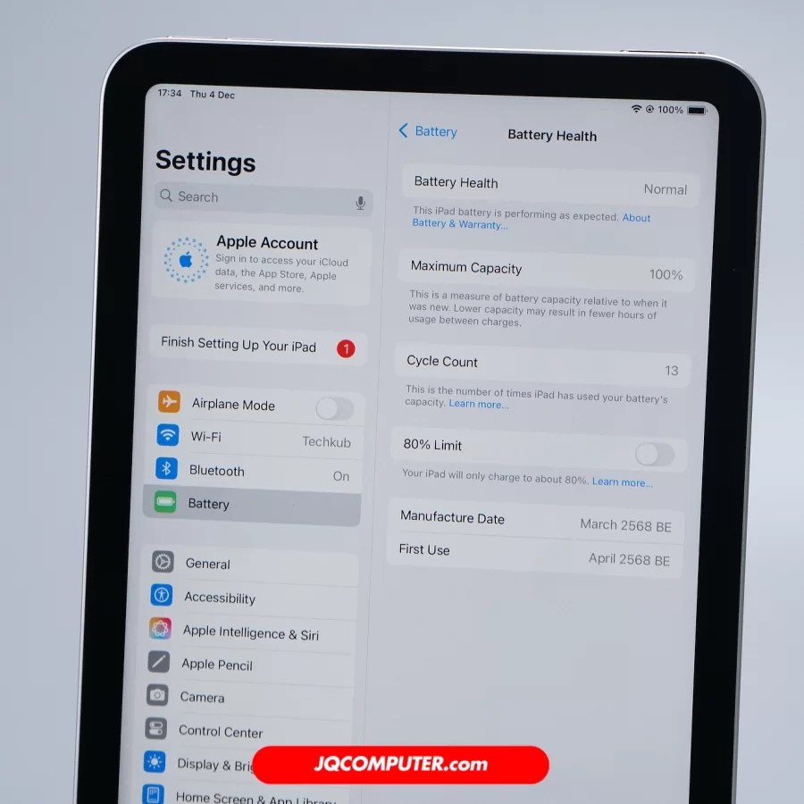 | สุขภาพแบตเตอรี่ | 100% (Cycle Count: 13 รอบ) |