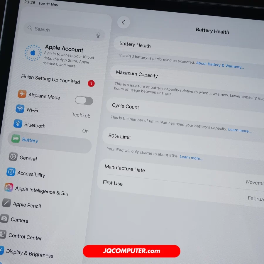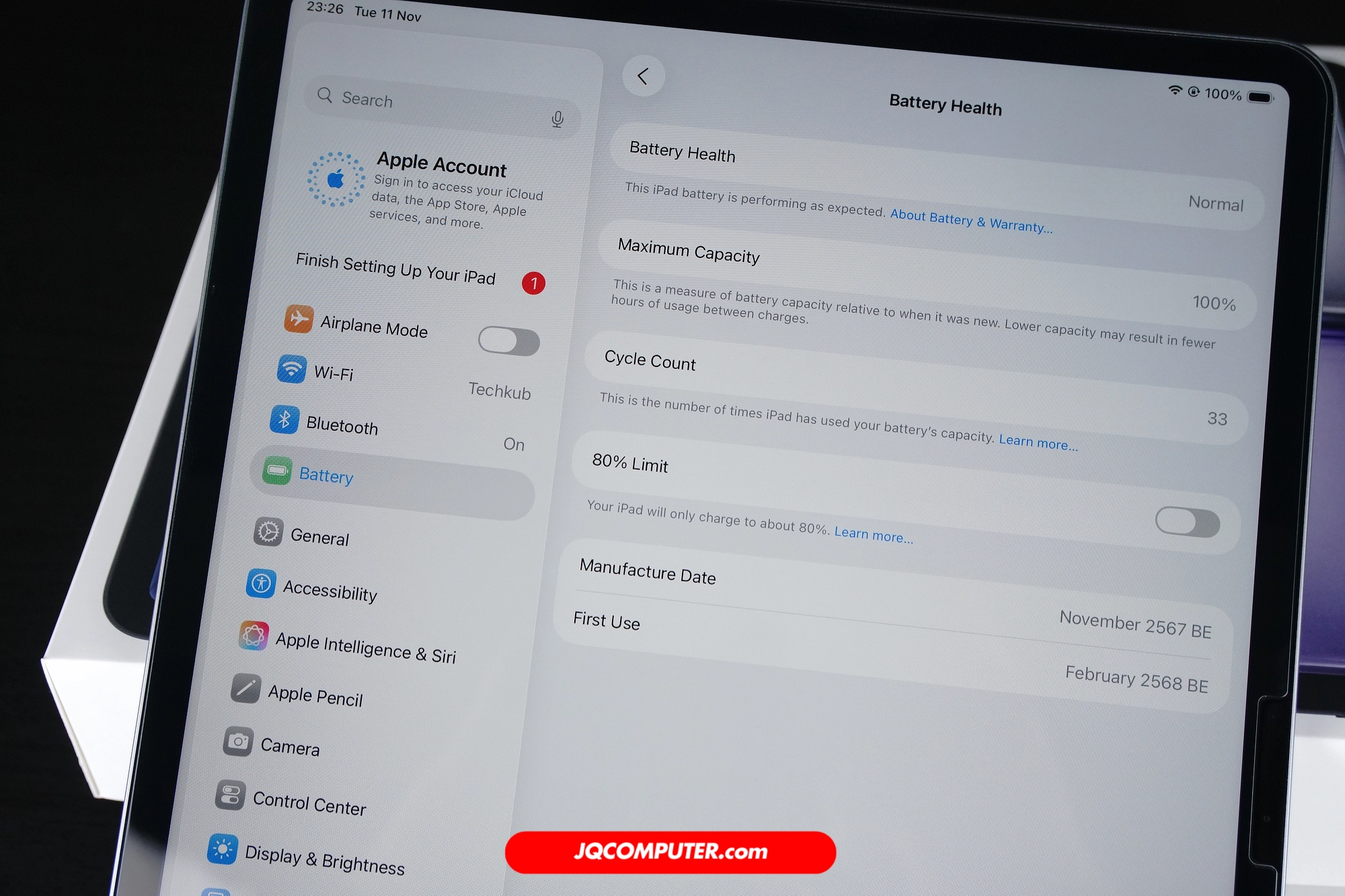 | สุขภาพแบตเตอรี่ | 100% (Cycle Count: 33 รอบ) |
