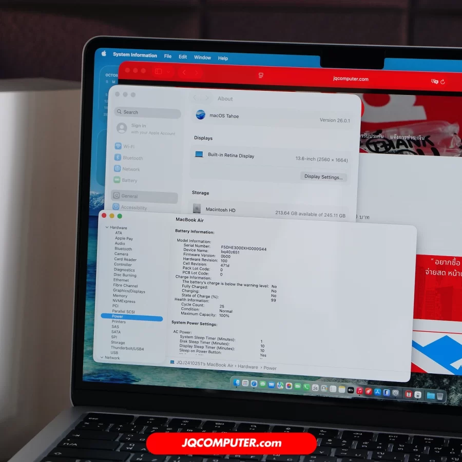 | สุขภาพแบตเตอรี่ | 100% (Cycle Count: 25 รอบ) |