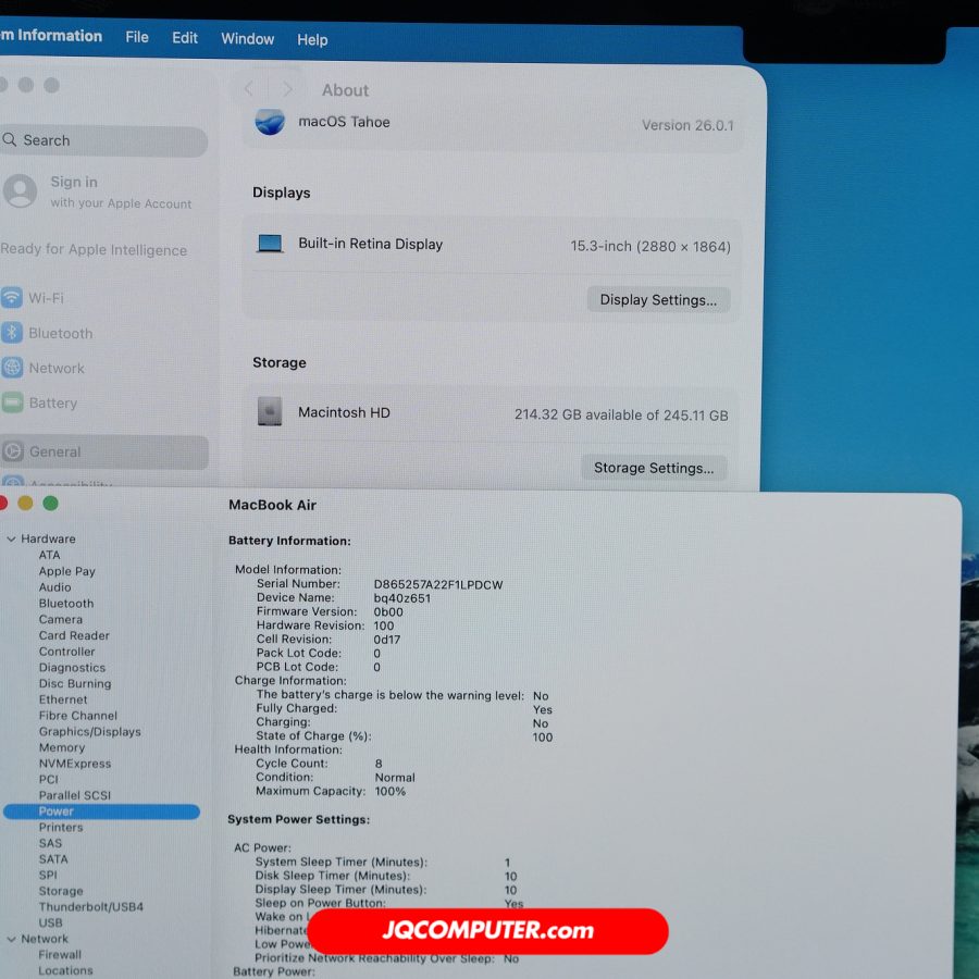 | สุขภาพแบตเตอรี่ | 100% (Cycle Count: 8 รอบ) |