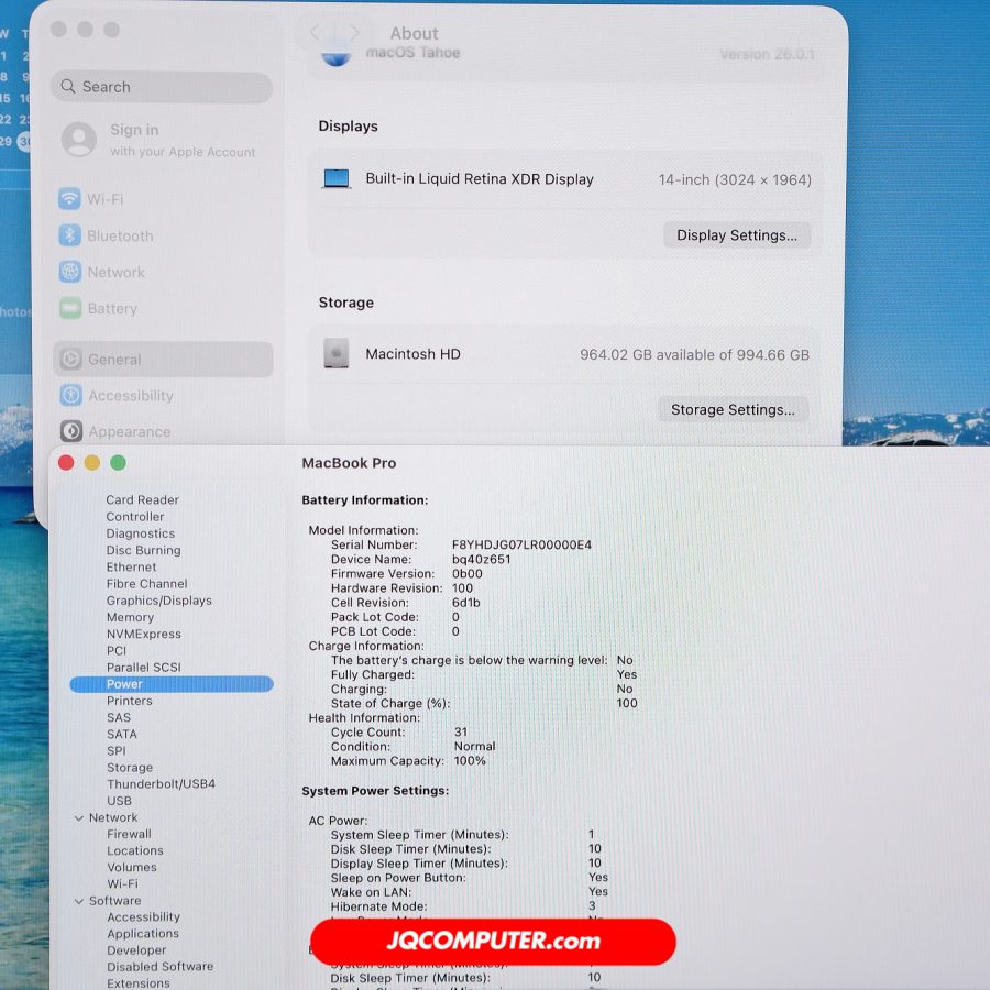 | สุขภาพแบตเตอรี่ | 100% (Cycle Count: 31 รอบ) |